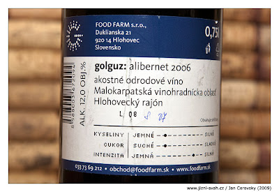 Další vzorek je Golguz Alibernet 2006, který jsem přitáhl z návštěvy Bratislavy za zhruba 250,- Sk. Moderní design, hra na „prémiovou řadu“ u vlastně nově vzniklého vinařství, jež je součástí velké agroskupiny… trochu mi to připomíná naše Nové Vinařství. Ale pěkných Alibernetů ze Slovenska jsem pil už dost a tenhle vypadal hodně nadějně – nálepka Salonu vín, zlatá z Víno Tirnavia 2007, stříbrná Vitis Aurea modra 2007, zlatá Vínne Trhy Pezinok 2007. Vytahuji plastový špunt a těším se na vinný zážitek. Barva velmi temná, mladičká a prakticky neprůhledná. Vůně v první plánu praští takovou tou přeextrahovanou „uni ovocitostí“ co najdete v každém druhém supermarketovém Chile či Kalifornii, včetně tamtéž obvykle přítomného bakelitu (čmuchněte si do prázdné KPZtky) a jiných umělých tónů. Postupným vlivem vzduchu se projev trochu mění, přichází černorybízový džus, dřevitost a především nádoba s kvasícím zelím, trochu zelenějších a divočejších tónů, prostě takový mírně Cabernet Moravia styl. Není to moc sladěné, ale vzhledem k tomu plastovému špuntu předpokládám, že bylo myšleno na rychlejší vypití a ne nějakou archivaci. Chuť dost tvrdá a trpká s lehkou hořčinou na konci, vlastně dost tenká, jednoduchá a vůbec. Ty medaile nechápu. Žena to doplnila poznámkou „má to pecky ve vůni i v chuti, asi to moc zmáčkli“. Tož tak. Detailnější info o víně na stránkách Domu národných vín.